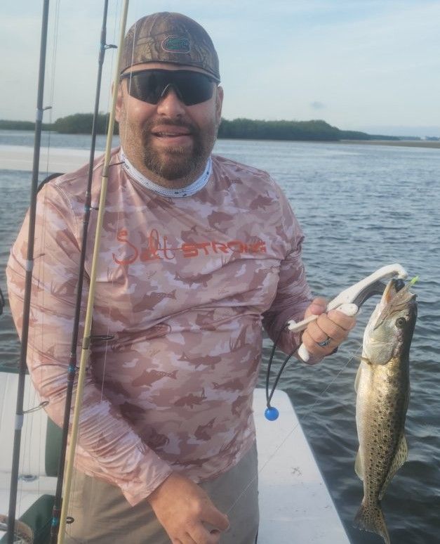 Sea trout, or speckled trout, are a staple of our inshore fishing with their distinctive spots and bright yellow fins. Most run 14-20 inches and 1-3 pounds, perfect for light tackle fun. They prefer grass flats and shallow bays, especially around structure like oyster bars and drop-offs. Night fishing is particularly productive, but early morning and late evening work well too. Spring through fall offers the best action, though they school up in deeper water during winter cold snaps. Guests enjoy them because they're scrappy fighters, relatively easy to catch, and make outstanding table fare - mild, flaky white meat that's hard to beat. The key to consistent trout fishing is working soft plastics or live shrimp slowly along the bottom near grass beds. When you find one, work the area thoroughly since they often travel in small groups.